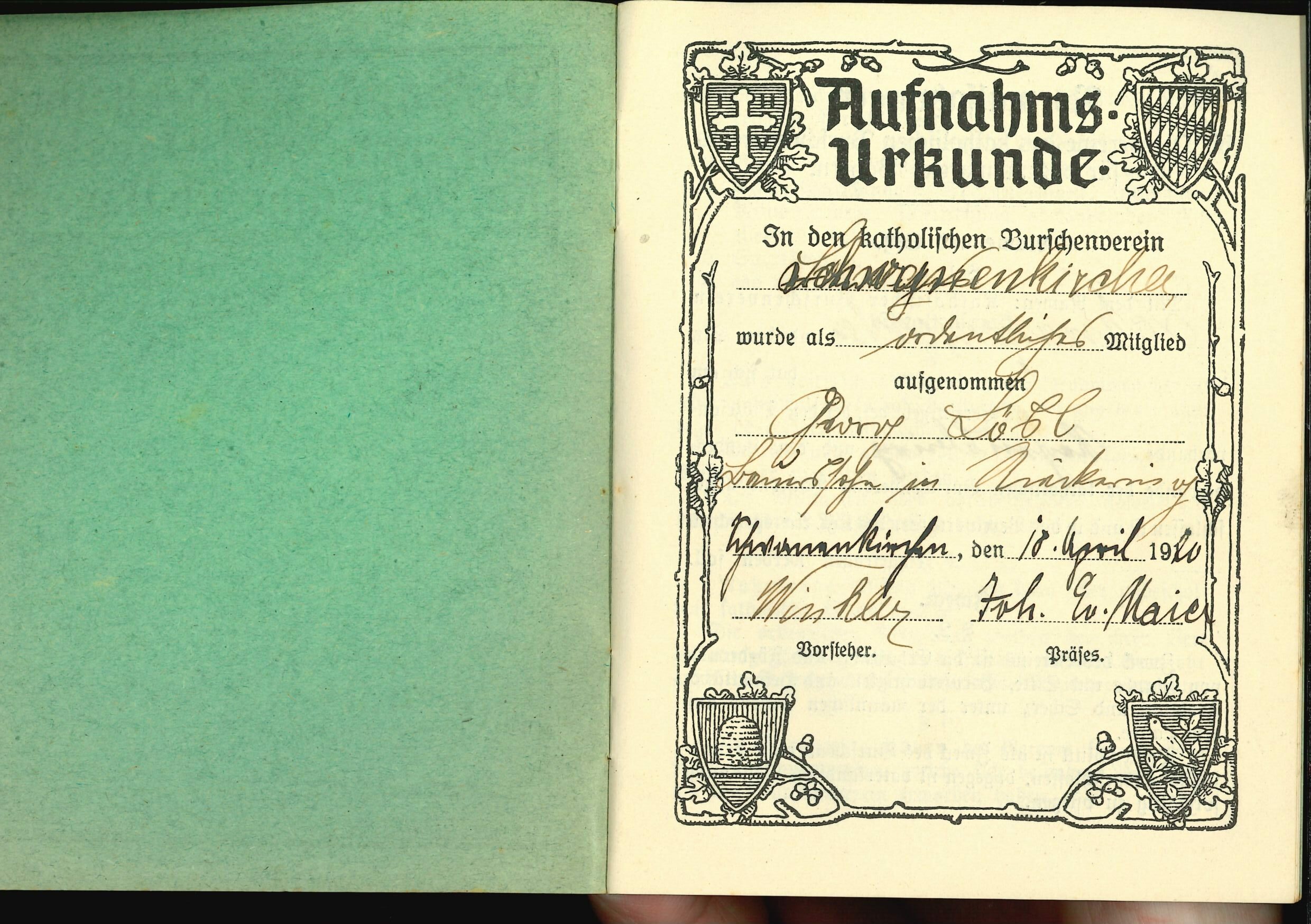 Das gab es wirklich mal in Schwanenkirchen, unten rechts steht: Aufgenommen wurde damals in die Bruderschaft 1913, Frau Hedwig Zacher Bauerstochter von Lapferding. Unterschrieben vom damaligen Pfarrer in Schwanenkirchen Herrn Schwaiger.