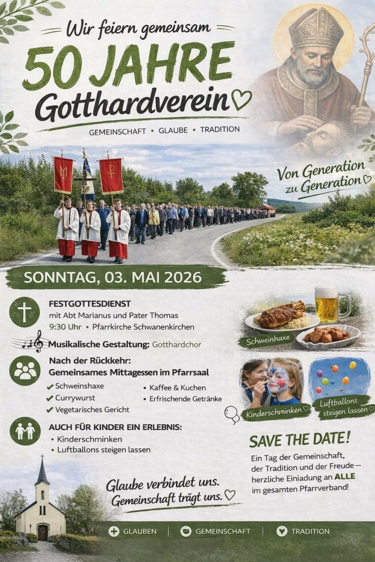 Festgottesdienst zur Eröffnung der Gotthardwoche 2025 mit Pfarrer Andreas Schätzle von Radio Horeb, den Vereinen und vielen Besuchern aus der Bevölkerung. Ein sehr schöner Gottesdienst mit gutem Besuch und anschließender Gotthard Statio in der Kirche mit Gotthardlitanei und Gotthardlied weil es regnete und die Prozession nach Reichersdorf aufgefallen ist. Auch der Besuch im Pfarrsaal nach dem Gottesdienst war mehr als gut besucht. Ein rundum gelungenes Fest des Gotthardverein Schwanenkirchen/Reichersdorf.