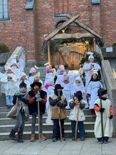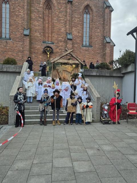 Am Heiligen Abend berührten die jungen Darsteller des Schwanenkirchener Krippenspiels mit der Geschichte von der Geburt Jesu die Herzen der Besucher und sorgten für eine feierliche Einstimmung auf das Weihnachtsfest. Trotz eisigen Winds standen die Kinder im Alter von drei bis zehn Jahren tapfer auf der Bühne und spielten mit sichtbarer Freude und großer Begeisterung. Bereits seit Oktober hatten sie mit viel Fleiß und Ausdauer für ihren großen Auftritt geprobt. In der stimmungsvollen Kulisse des Pfarrinnenhofs erwachten Engel, Hirten, die Heilige Familie und der Erzengel zum Leben und ließen die Weihnachtsgeschichte eindrucksvoll lebendig werden. Als Erzählerin führte Hannah Fixl ruhig und sicher durch das Geschehen. Maria und Josef wurden von Emily Steinbauer und Dominik Weinberger dargestellt, während Lukas Krawetz als Erzengel die Handlung begleitete. Mit viel Liebe zum Detail schlüpften alle Kinder in ihre Rollen. Die Hirten wärmten sich am Feuer, die Engel schwebten aufgeregt umher und die Heilige Familie machte sich auf Herbergssuche, bevor sich schließlich alle am festlich geschmückten Stall versammelten – ein bewegender Moment für Mitwirkende und Publikum gleichermaßen. Zum Abschluss stimmten Kinder und Zuschauer gemeinsam „Stille Nacht“ an, begleitet von Pater Praveenam Klavier. Langanhaltender Applaus würdigte die beeindruckende Leistung der jungen Darstellerinnen und Darsteller. Jedes der 28 Kinder wurde namentlich aufgerufen und für sein Engagement besonders geehrt. Nathalie Krawetz hatte mit viel Geduld und Herzblut die Proben mit der Kinderschar geleitet. Für den guten Ton sorgte Fritz Schosser, dessen technische Unterstützung dafür sorgte, dass alle Sprecherinnen und Sprecher klar und deutlich zu hören waren.